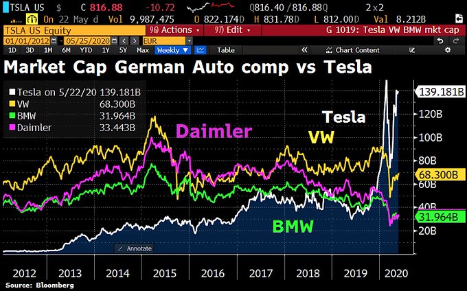 6 miljardi lielāka kapitalizācija nekā vāciešus kopā ņemot  Cik lasu, tad vidējais Teslas akcijas pircējs taisās dzīt cenu augšā SpaceX projekta dēļ, kas tiek palaists gaisā 27.05. https://www.spacex.com/launches/ Lai cena būtu 900$, vajag nieka 10% kāpumu vēl. Skatoties uz fjūčersiem, būšu izbrīnīts, ja maija pēdējā nedēļa nepārkāps S&P 3000 slieksni. Bullish |