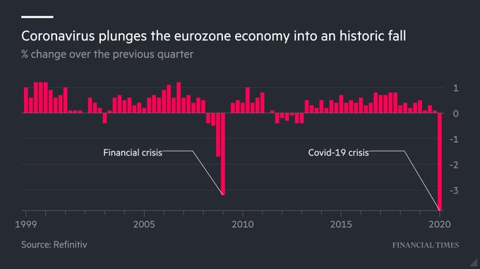 Eirozonas 2020. gada pirmā ceturkšņa IKP kritums ir iespaidīgāks par 2008. gada kritumu.